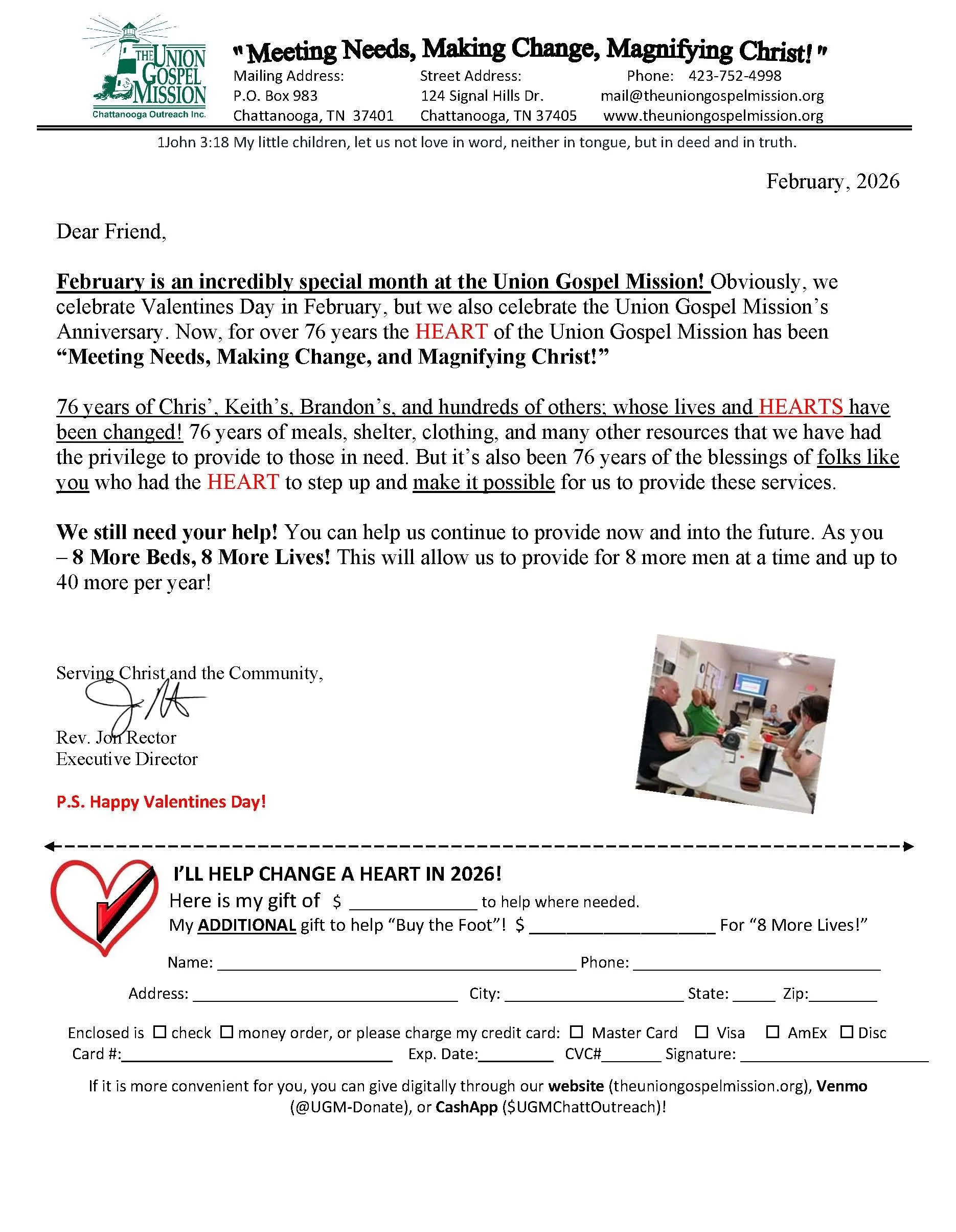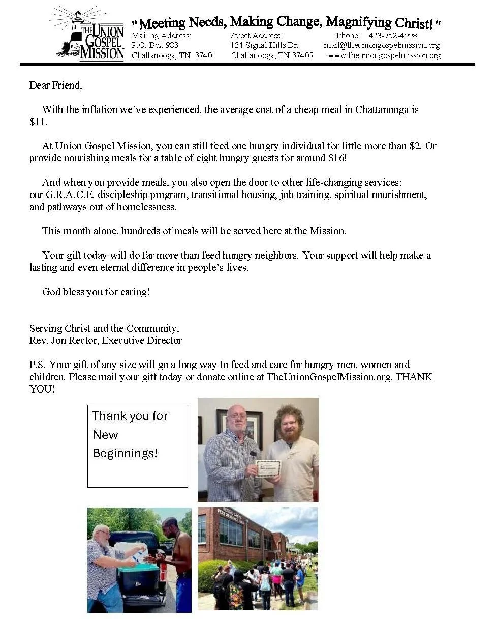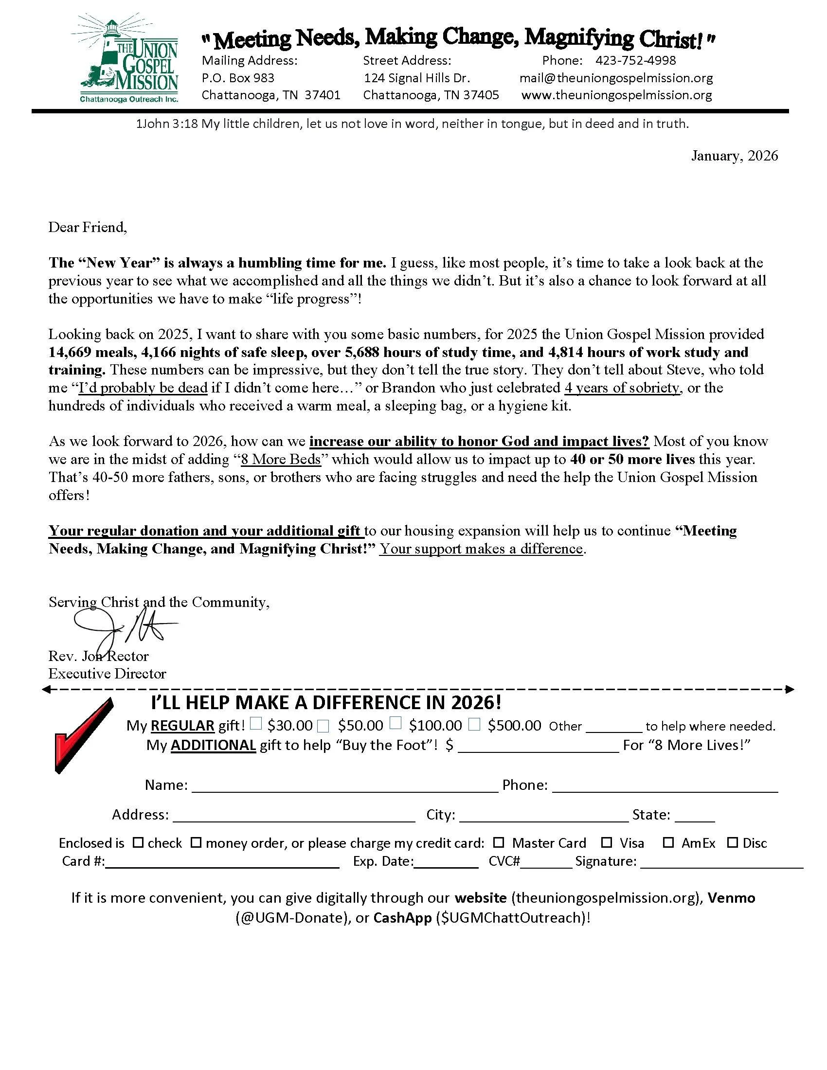 The Union Gospel Mission (Chattanooga Outreach, Inc) is an IRS approved 501(c)3 organization.